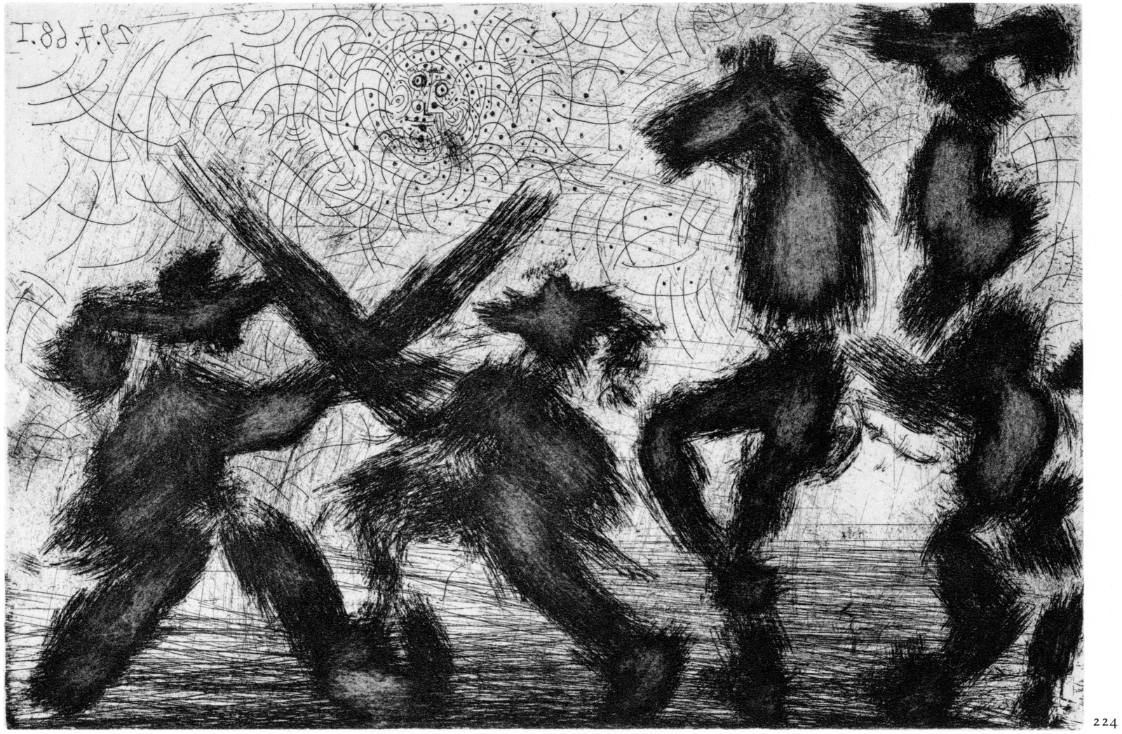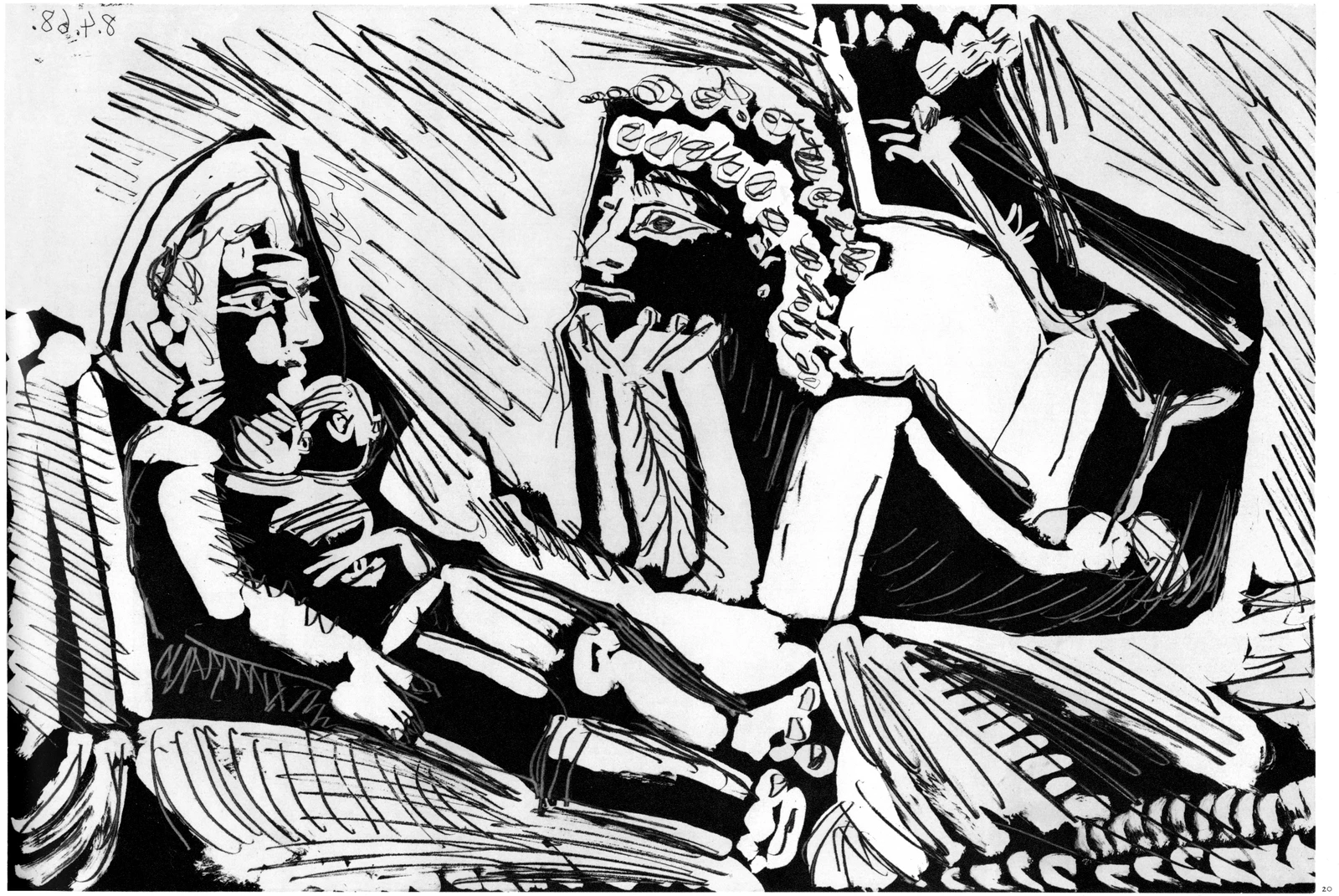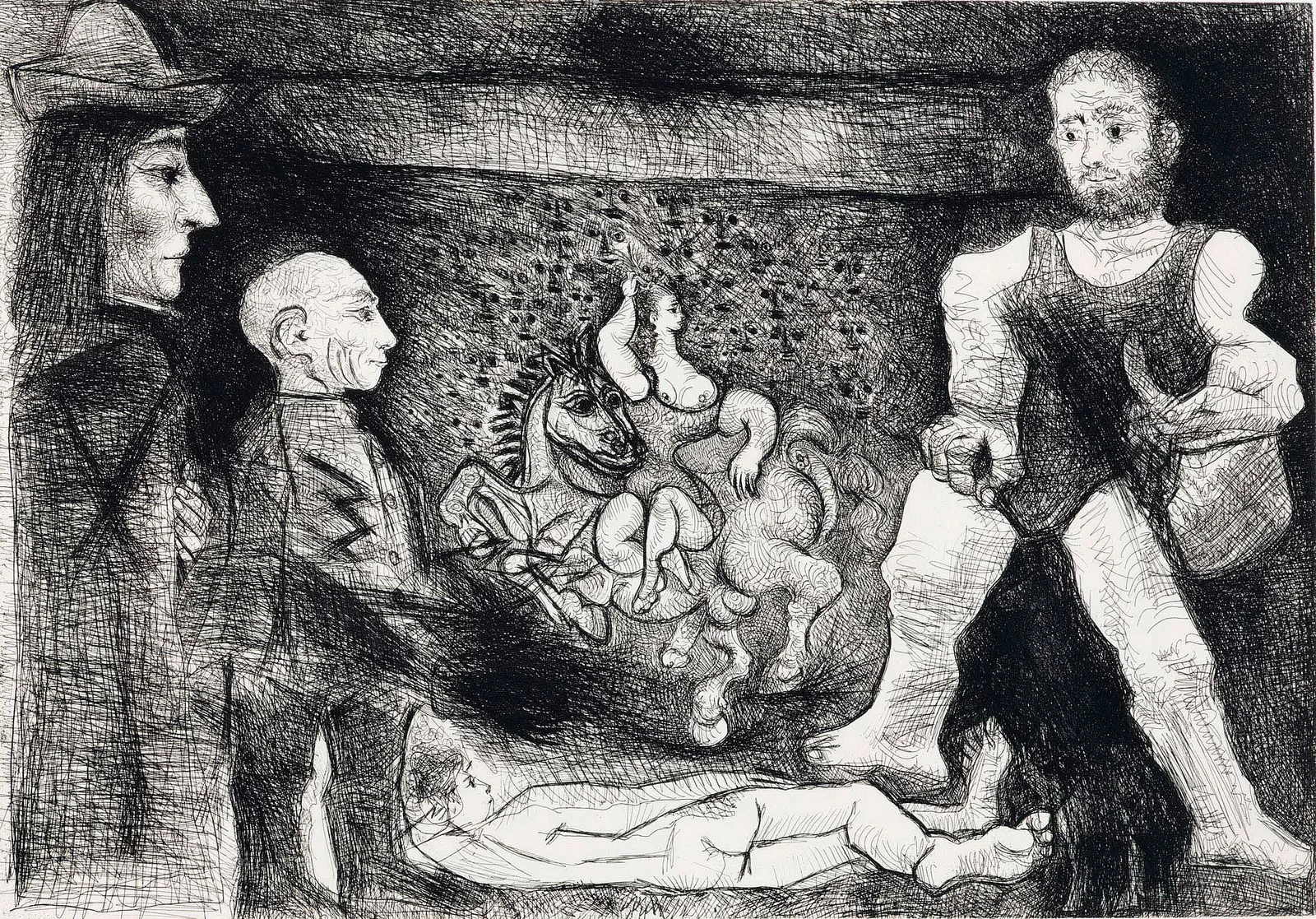 Pablo Picasso (1881–1973) was a master printmaker. He experimented with different techniques throughout his life, combining them to satisfy his exuberant imagination, his creative drive and the expressive needs of his swift hand. Between March and October 1968, he created no fewer than 347 engravings. Ignoring all norms, he mixed etching, aquatint, sugar aquatint, drypoint etching and mezzotinto, all at the same time, but separately. Precise, fast lines alternate with black surfaces mixed with carefully lined hatching. The observer is immersed in a stream of images: from one sheet to the next, we see a parade of performers, courtesans, musketeers, artists and models in their costumes, revelling in the comedy of existence and displaying the humour and melancholy of the ageing artist. The exhibition presents 85 artworks from the significant 347 Series, on loan from a private collection in Zug. This extraordinary series has not been presented in this form before in German-speaking Switzerland.